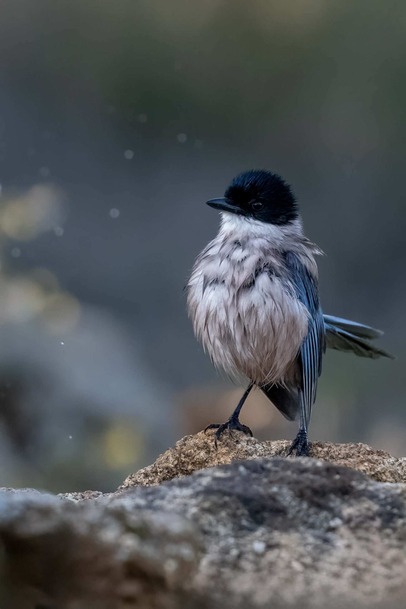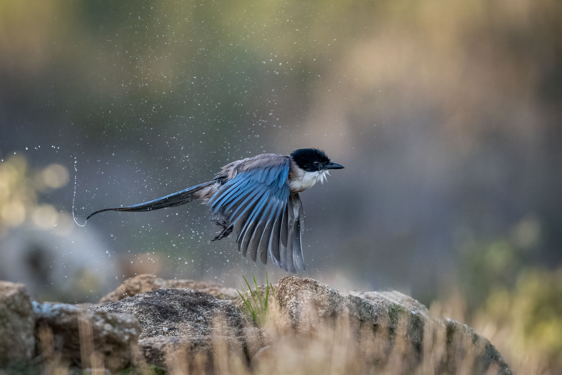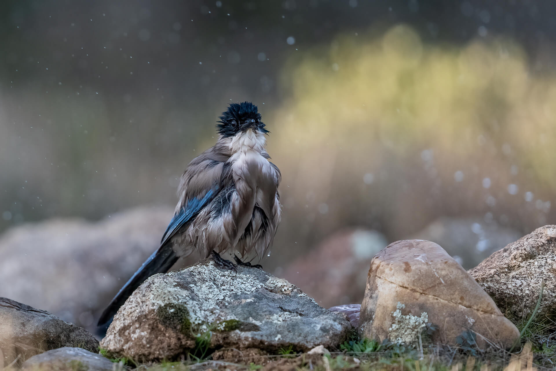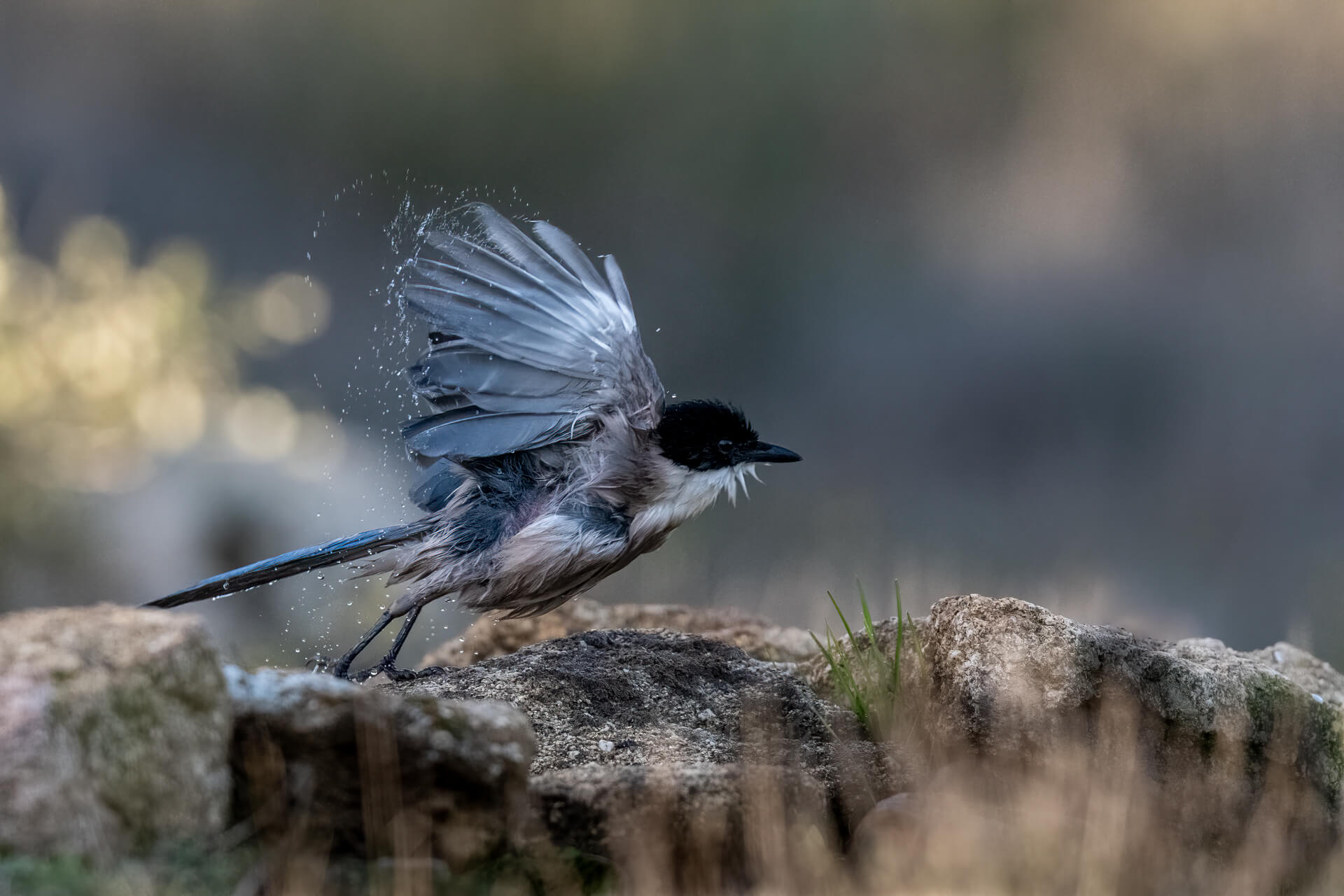 Kaum hatte die erste vorsichtig das Wasser geprüft folgten die anderen – und verwandelten die Szene in ein spitzendes Schauspiel. Mit ausgebreiteten Flügeln tauchten sie ins kühle Nass, schlugen mit den Flügeln, warten Wassertropfen in die Luft und schüttelten sich mit sichtbarem Vergnügen. Das sonst so glatte Gefieder stand plötzlich zerzaust ab, der lange blaue Schwanz wirkte schwer und dunkel vom Wasser. Besonders habe ich mich gefreut über den Moment, als eine Blauelster losflog und sich in der Luft das Wasser aus dem Gefieder schüttelte.