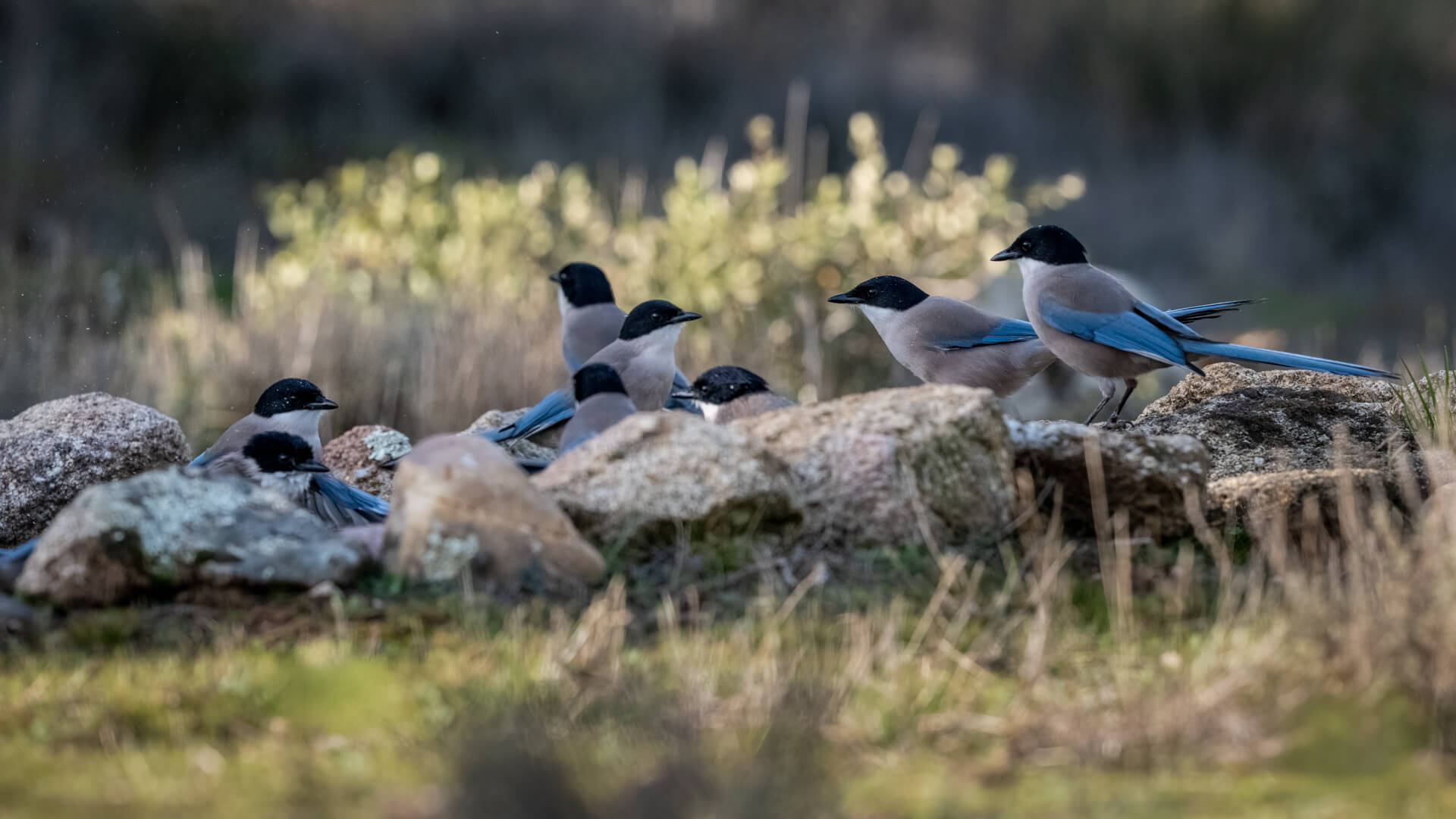 Bei meinem letzten Spanienbesuch habe ich vergeblich versucht, diese lebendigen Vögel gut vor die Kamera zu bekommen, aber sie waren immer sofort weg, wenn man sich nur näherte. Diesmal, als wir auf den Luchs warteten, kam plötzlich ein ganzer Trupp Blauelstern an die Wasserstelle! Was für eine phantastische Überraschung!
